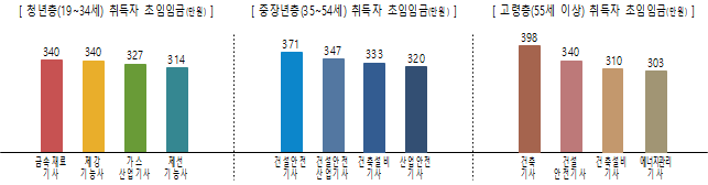 연령대별로 살펴보면 청년층(19~34세)에서는 금속재료기사, 제강기능사가 각 340만 원, 가스산업기사 327만 원, 제선기능사 314만 원 순이었다. 중장년층(35~54세)은 건설안전기사(371만 원), 건설안전산업기사(347만 원), 건축설비기사(333만 원)가 상위권을 차지했다. 고령층(55세 이상)은 건축기사가 398만 원으로 가장 높았고, 건설안전기사(340만 원), 건축설비기사(310만 원), 에너지관리기사(303만 원)가 뒤를 이었다.
