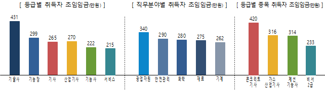 한편, 2023년 국가기술자격 취득자 중 2024년 7월 말 기준으로 고용보험 가입 이력이 있는 실제 취업자(17만3,000명)를 분석한 결과, 자격등급별 중위 초임임금은 기술사 431만 원, 기능장 299만 원, 기사 265만 원, 산업기사 270만 원, 기능사 222만 원, 서비스직 215만 원으로 나타났다.