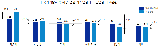 예를 들어 기술사나 기능장처럼 높은 경력을 요하는 자격은 초임임금이 제시임금보다 높게 나타났지만, 대부분의 기사나 산업기사 자격은 초임이 채용공고상의 임금보다 낮은 수준에 머물렀다.
