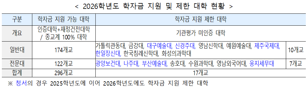 지원 가능 대학은 기관평가에서 인증을 받은 대학 288곳과 종교지도자 양성 목적의 대학 8곳을 합쳐 총 296곳이다. 반면, 지원 제한 대학은 기관평가에서 ‘미인증’ 판정을 받은 일반·산업대 10곳과 전문대 7곳으로, 이들 대학은 2026학년도 1년간 국가장학금과 학자금 대출(취업 후 상환·일반 상환) 모두 제한된다.