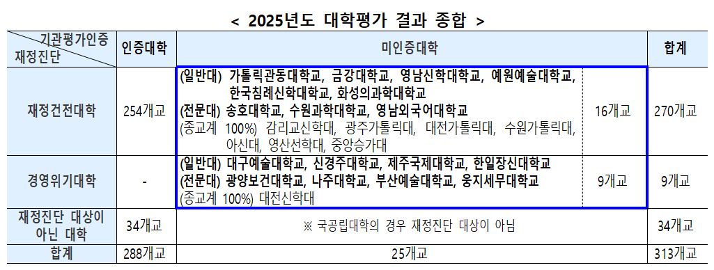 사립대학 279개교(일반·산업대 156, 전문대 123)를 대상으로 한 재정진단에서는 270개교가 재정건전 대학, 9개교가 경영위기 대학으로 지정됐다. 경영위기 대학 수는 전년보다 5곳 감소했다.