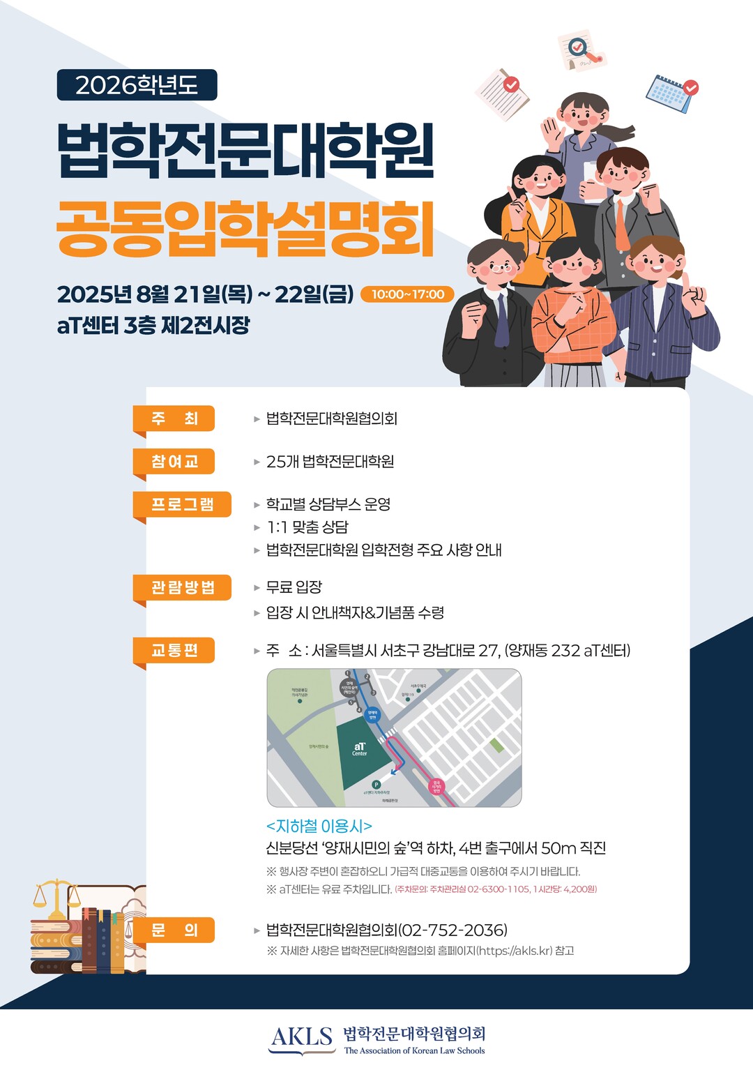 [피앤피뉴스=마성배 기자] 예비 법조인을 꿈꾸는 수험생들을 위한 ‘2026학년도 법학전문대학원 공동입학설명회’가 오는 8월 21일(목)부터 22일(금)까지 양일간 오전 10시부터 오후 5시까지 서울 aT센터에서 개최된다.