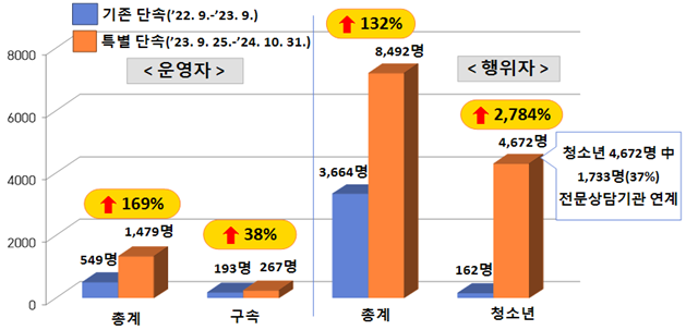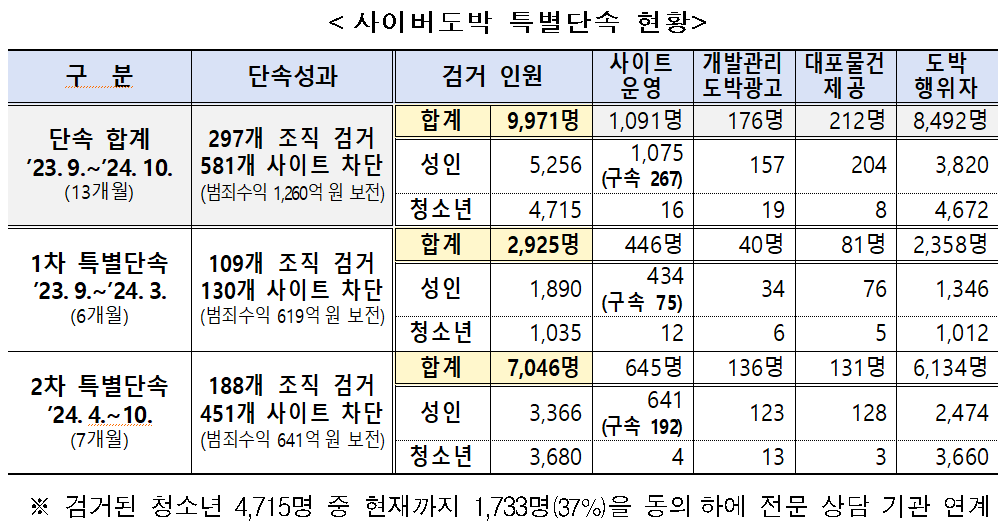 지난 2023년 9월부터 시작된 특별단속에서는 청소년 4,715명을 포함해 총 9,971명이 검거됐으며, 불법 도박사이트 운영 조직 297개가 적발됐다.