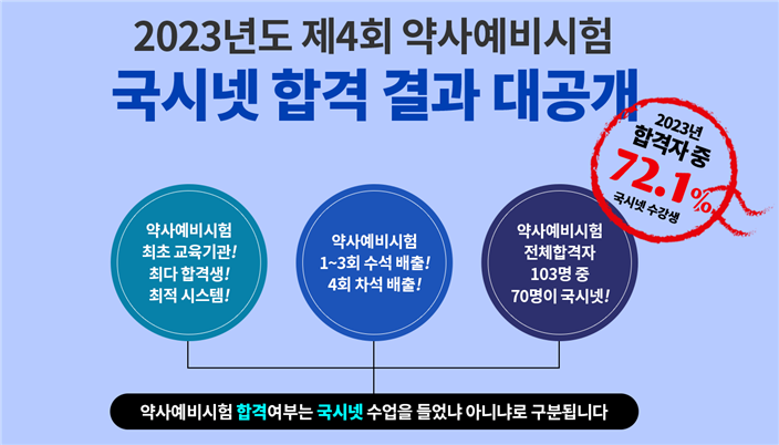 국시넷은 2020년부터 4년 동안 시행된 약사예비시험의 전체 합격자 107명 중 70명을 배출한 약사 및 의사예비시험 전문교육기관으로써 5년 연속 합격자 수 압도적 1위 기록을 무난하게 이어나갈 것으로 예상되고 있다.