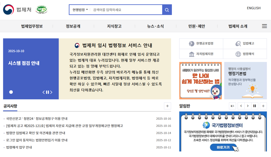 법제처는 서비스 중단 직후 곧바로 임시포털을 개설하고, 대표 누리집에 긴급 게시판을 추가해 현행공포법령·입법예고·자치법제지원·맞춤형 법령정보 신청·행정규칙 등 주요 서비스를 지속 제공했다.
