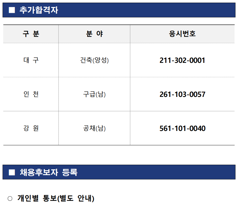 최종합격자의 임용포기로 결원이 발생하여 추가합격자를 공고하오니 추가합격자는 응시지역에 채용후보자로 등록하시기 바랍니다.