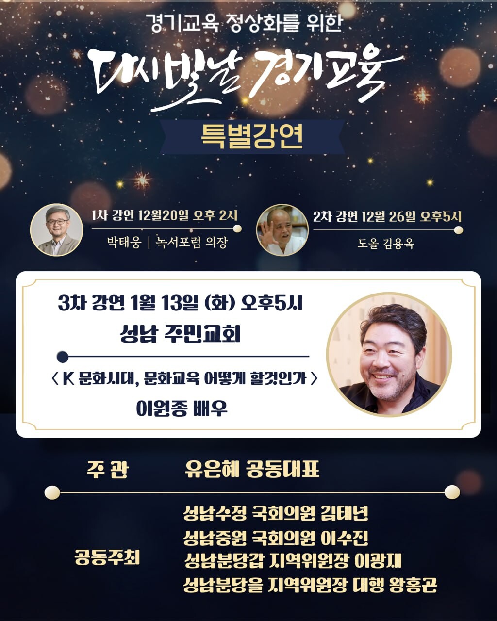[피앤피뉴스=마성배 기자] 디지털과 철학을 넘어 ‘문화’로 경기교육의 외연을 넓히는 논의가 성남에서 이어진다. 시민행동 네트워크 ‘다시 빛날 경기교육’이 오는 13일 성남 주민교회에서 를 주제로 세 번째 특별강연을 열고, 배우 이원종을 초청해 문화 현장의 경험을 토대로 공교육이 나아갈 방향을 짚는다.