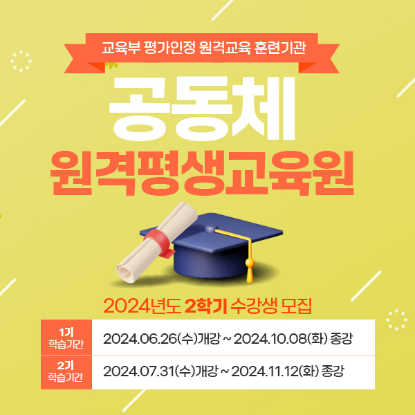 ㈜공동체원격평생교육원은 교육부 평가인정 기관으로 국가자격증 및 경영학, 심리학 등 학위취득 교육과정을 운영하고 있으며 오는 7월 31일까지 2-2기수 과정을 모집하고 있다고 밝혔다.