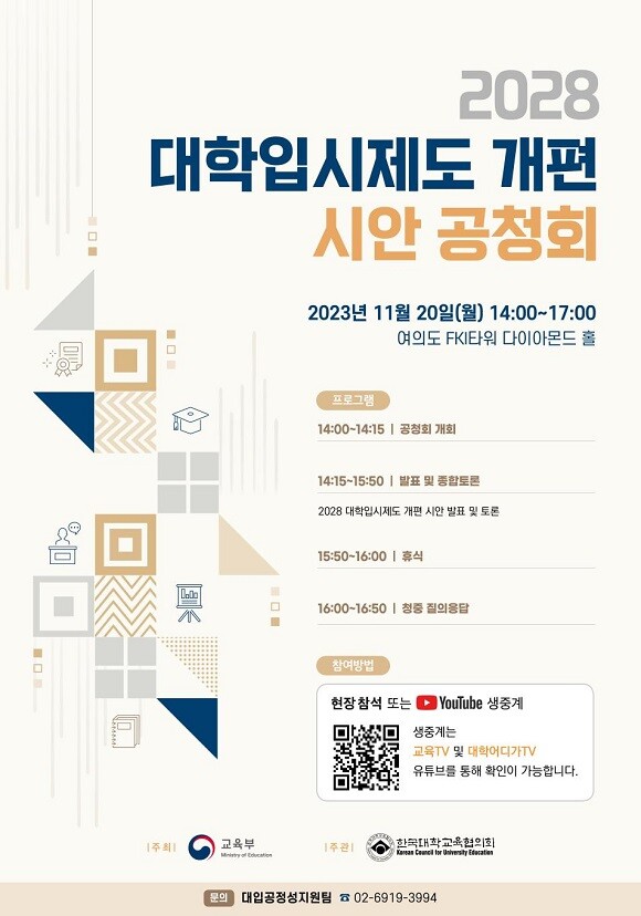 교육부는 ‘2028 대학입시제도 개편 시안’에 대한 공청회를 서울 여의도 에프케이아이(FKI) 타워에서 11월 20일에 개최한다고 밝혔다.