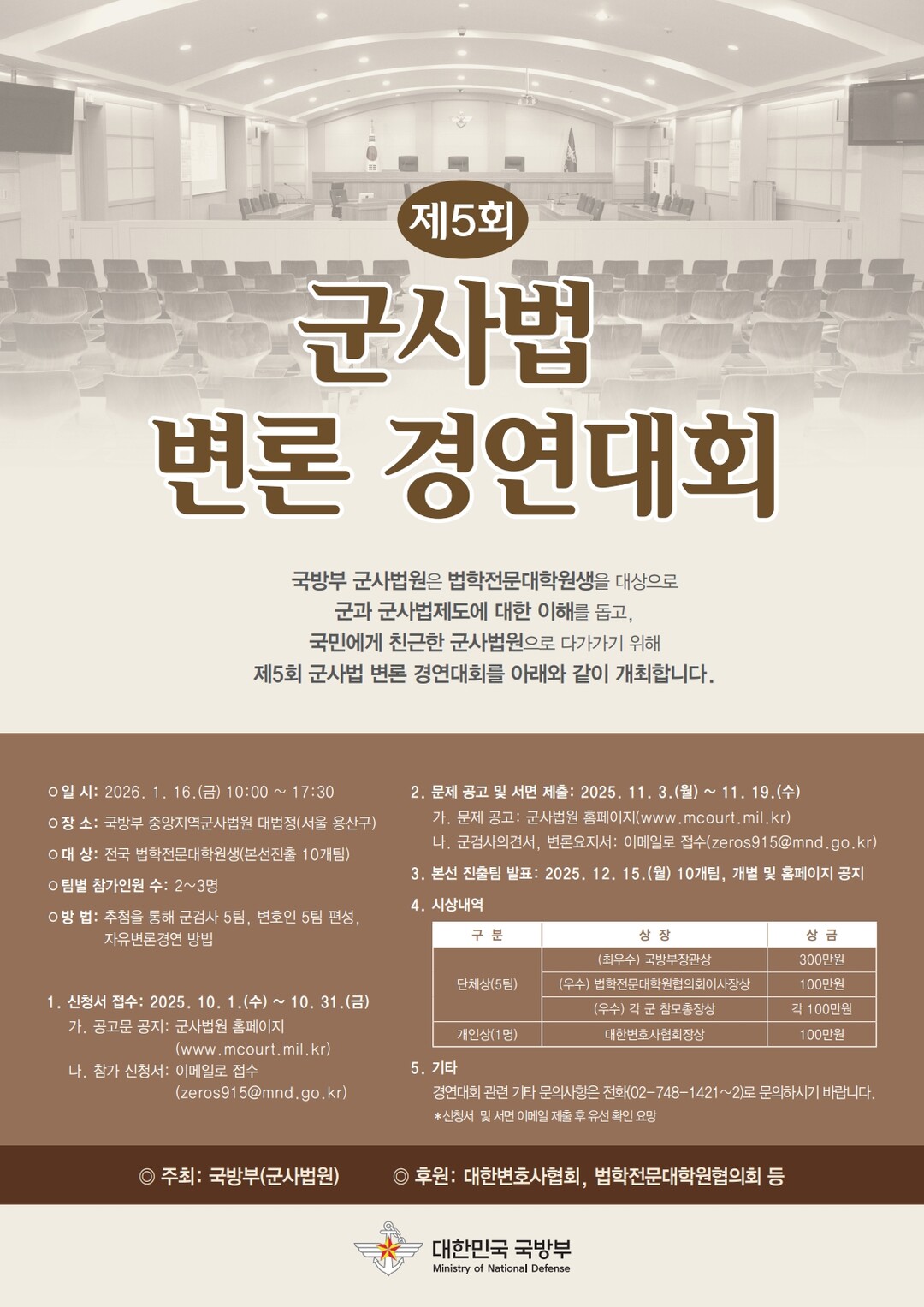 참가 신청은 2025년 10월 1일부터 31일까지 진행되며, 군사법원 홈페이지(www.mcourt.mil.kr)에서 공고문을 확인한 뒤 이메일(zeros915@mnd.go.kr)을 통해 접수해야 한다.