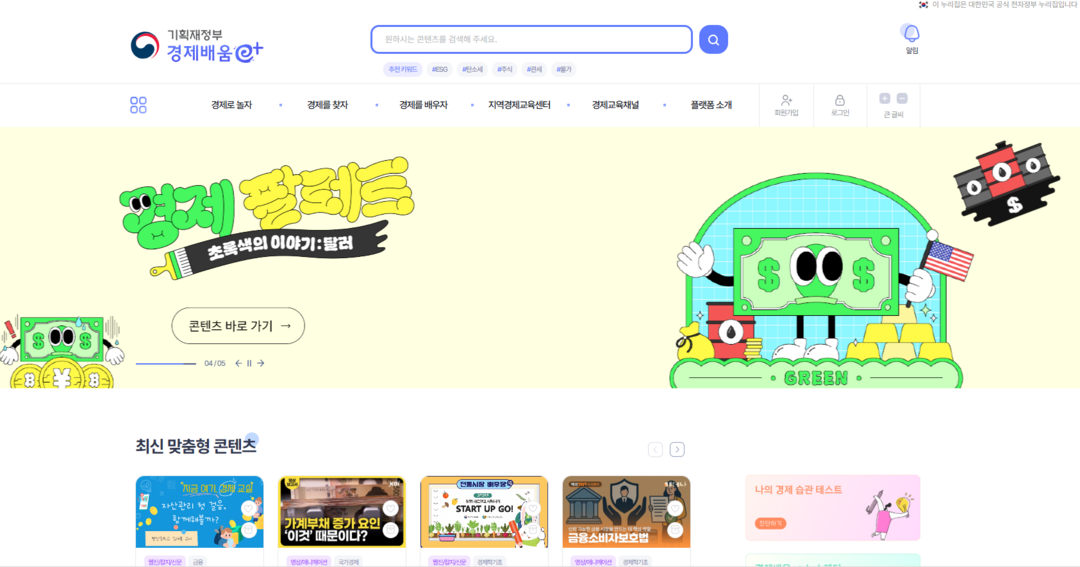 기획재정부가 운영하는 ‘경제배움e+’는 누구나 쉽게 경제 개념을 익힐 수 있도록 구성된 디지털 교육 플랫폼이다.