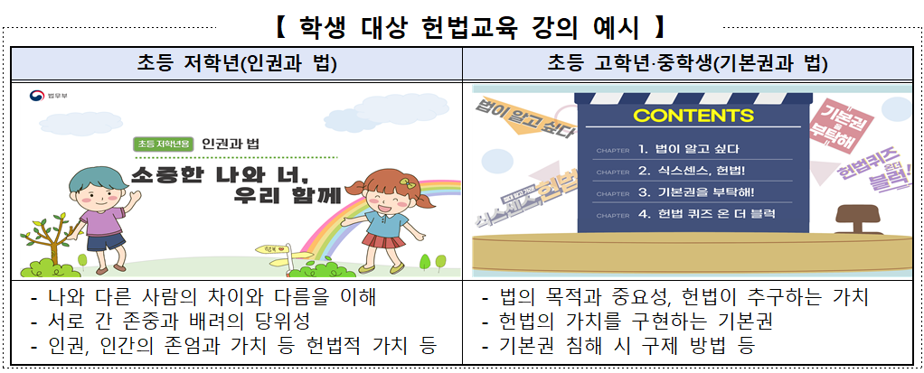 교육부는 법무부와 협력해 ‘2025년 헌법교육 전문강사 출장강의’를 학교 현장에 본격 지원한다. 신청 학교를 대상으로 전문강사가 교과수업과 창의적 체험활동 시간에 직접 방문해 헌법의 기본 정신, 인권·기본권, 법의 역할 등을 강의한다.