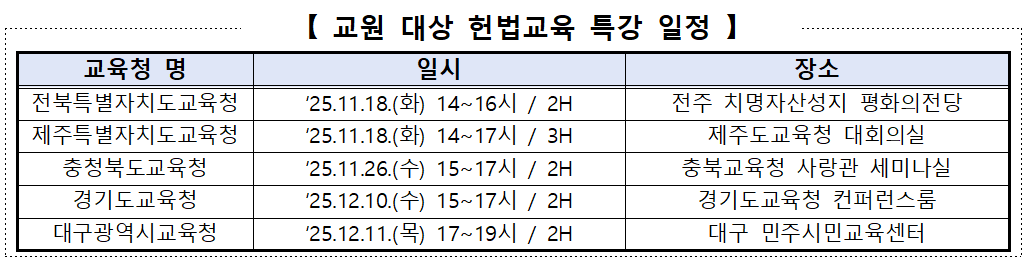 교원을 위한 헌법교육 역시 강화된다. 헌법재판연구원 교수진이 직접 강사로 참여해 헌법의 기본 원리, 헌법재판 기능과 절차, 주요 판례 등을 강의하는 특강 프로그램이 전국 5개 시·도교육청(대구·경기·충북·전북·제주)에서 순차적으로 운영된다. 특강은 11월 18일 전북과 제주에서 시작해 충북·경기·대구로 이어진다.