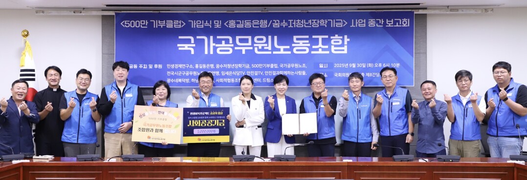 국공노는 9월 30일(화) 오후 국회의원회관 제8간담회실에서 열린 홍길동은행/꿈수저 청년장학금의 ‘500만 기부 클럽 가입식’에 참여해 기부금을 전달했다고 밝혔다.