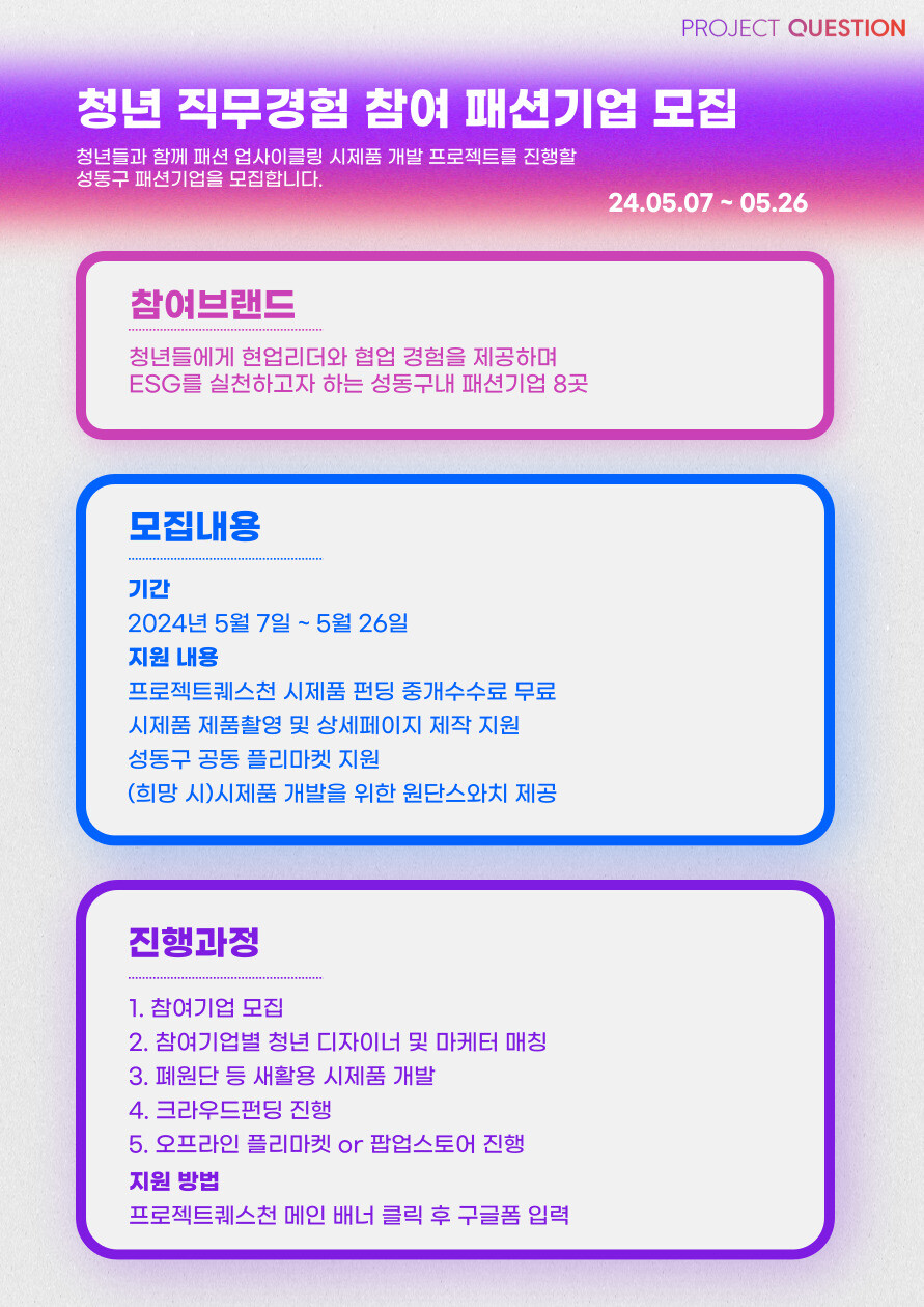 소셜벤처 프로젝트퀘스천(대표 최은원)이 디자인 분야 직무 경험이 필요한 청년을 연결하여 일자리 매칭 문제를 해결하고 창의적인 아이디어를 현실화하는 ‘성동구 패션기업 ESG 실무 프로젝트 기획전’을 진행한다고 7일 밝혔다.