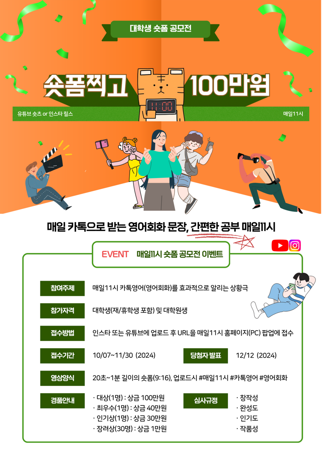 이번 공모전의 주제는 매일11시의 영어회화 서비스인 카톡영어를 창의적이고 효과적으로 알리는 상황극이다. 참가자들은 20초에서 1분 내외의 짧은 영상을 제작해 제출할 수 있다.