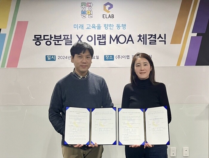 [피앤피뉴스=이수진 기자] 에듀테크 전문기업 (주)이랩(대표 황예지)이 디지털미디어교육콘텐츠 교사연구협회 몽당분필(대표 박준호)과 지난 11일 상호 간의 협력을 위한 MOA를 체결하였다고 밝혔다.