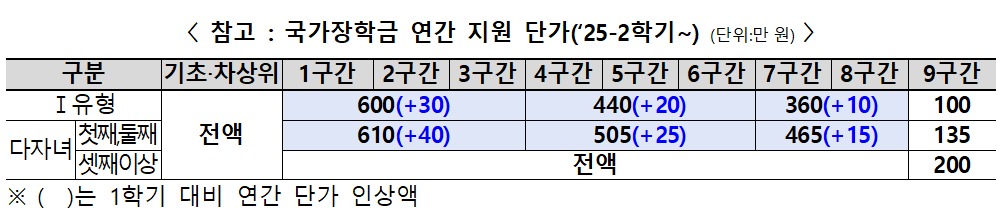 특히 이번 2학기부터는 지원 단가가 최대 40만 원까지 인상됐다. ▲1~3구간은 기존보다 30만 원 오른 600만 원(다자녀 가구는 40만 원 인상된 600만 원), ▲4~6구간은 20만 원 인상된 440만 원(다자녀 25만 원 인상), ▲7~8구간은 10만 원 오른 360만 원(다자녀 15만 원 인상)이 각각 적용된다. 다만 연간 기준 단가이므로 이번 2학기에는 구간별 금액의 절반이 지급된다. 예컨대 1~3구간 학생은 2학기 장학금으로 300만 원을 받을 수 있다.