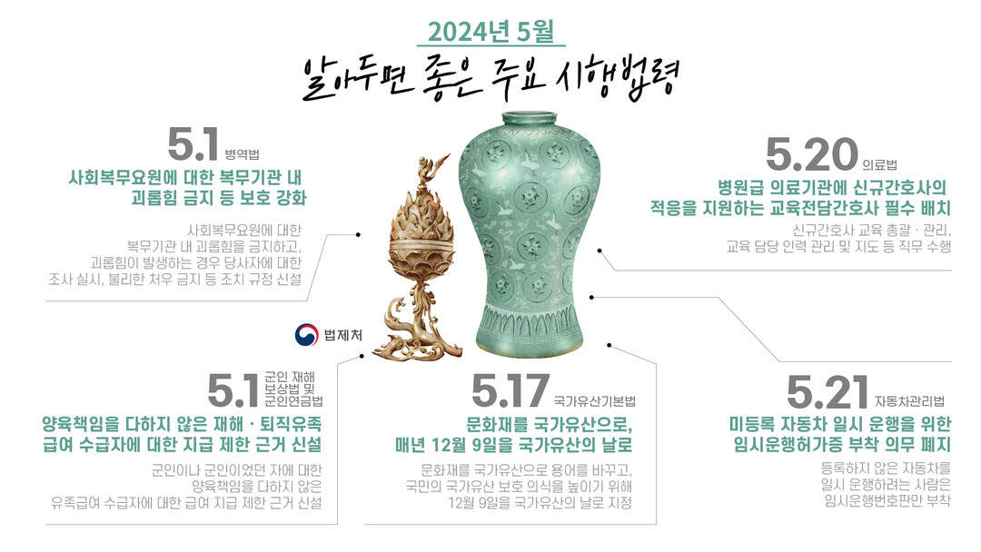[피앤피뉴스=마성배 기자] 내달 5월부터는 ‘문화재’ 대신 ‘국가유산’이라는 용어를 사용해야 하고, 사회복무요원 근무 환경 개선 및 미등록 차량 임시운행허가증 부착 의무가 폐지된다.