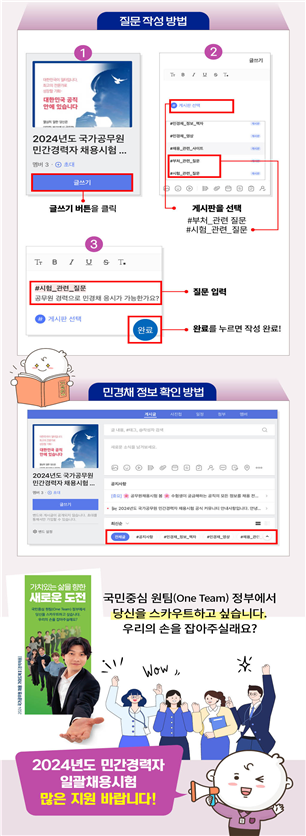 또한, 인사혁신처는 응시자에게 다양한 정보를 제공하기 위해 ‘네이버 밴드’에 ‘2024 민간경력자 채용 공식 커뮤니티’를 개설하고, 채용 정보와 일정을 실시간으로 공유할 계획이다.