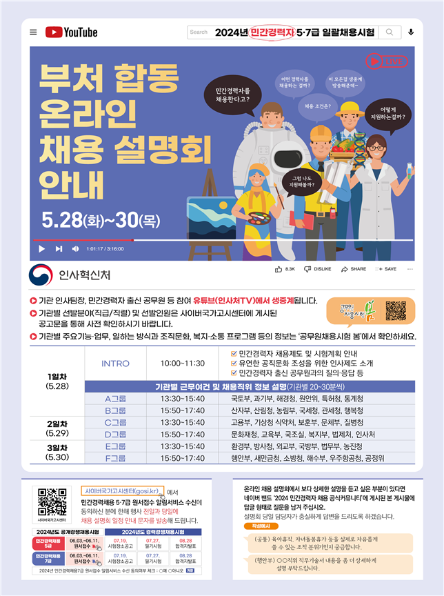 인사혁신처는 추가적으로 ‘인사처TV’를 통해 유튜브 생중계로 부처 합동 온라인 채용 설명회를 개최한다. 5월 28일부터 30일까지 3일간 진행되는 이 설명회에서는 36개 기관의 인사팀장 및 민간경력자 출신 선배 공무원이 참여해 직무 내용, 조직 문화, 복지 혜택 등에 대해 설명하고, 실시간으로 질의응답을 진행할 예정이다.