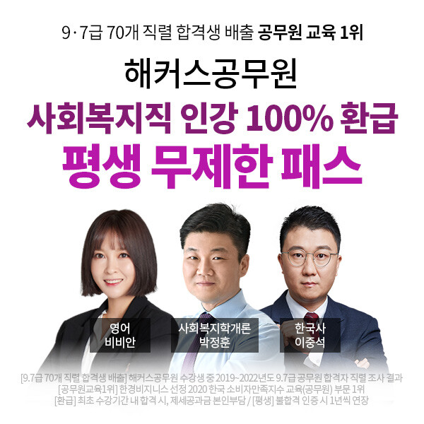 해당 환급패스 수강 시에는 공무원 국어 신민숙, 영어 비비안, 한국사 이중석 강사의 강의부터 행정법 함수민, 사회복지학개론 박정훈 강사 등 사회복지직 공무원 시험과목 전 강좌를 무제한으로 수강할 수 있다.