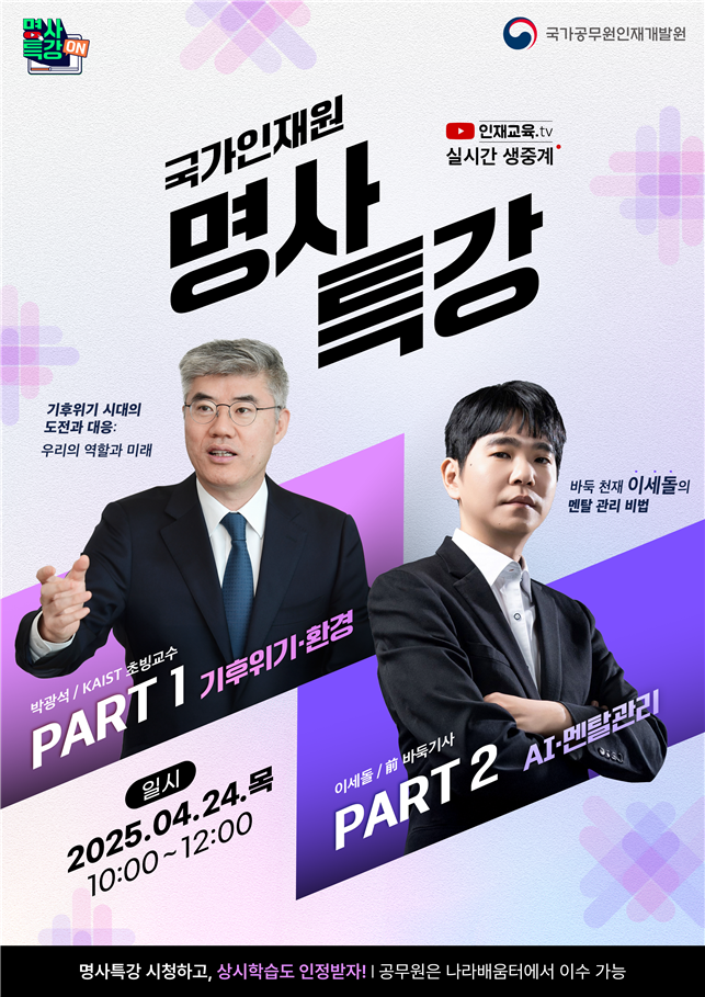 [피앤피뉴스=마성배 기자] 국가공무원인재개발원이 오는 24일(목) 오전 10시, 이세돌 전 바둑기사와 박광석 전 기상청장을 초청해 ‘AI 시대와 기후위기’를 주제로 실시간 공개 특강을 연다. 이번 특강은 유튜브 채널 ‘인재교육TV’를 통해 공무원은 물론 관심 있는 국민 누구나 시청할 수 있다.