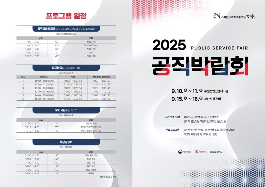 [피앤피뉴스=마성배 기자] 공무원을 꿈꾸는 청년들이 실제 시험과 면접 분위기를 경험하고, 다양한 채용 정보를 한자리에서 확인할 수 있는 ‘2025 공직박람회’가 막을 올린다. 수원에서는 1011일, 부산에서는 1516일 각각 열리며, 총 72개 중앙행정기관·지자체·공공기관이 참여한다.