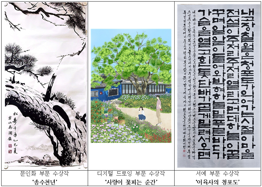 세부 수상작은 ▲문인화 3점(송수천년 등) ▲디지털 드로잉 4점(사랑이 꽃피는 순간 등) ▲서예 11점(이육사의 청포도·출문우성 등) ▲한국화 6점(솔 향따라 등) ▲서양화 12점(쉬었다 가는 길 등) ▲사진 11점(마중 등) ▲공예 3점(맹호도 치광대진정미 등)이다.