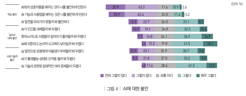 흥미로운 점은 ‘AI 학습 자체에 대한 불안’은 낮은 반면, ‘기술 발전이 가져올 직업적·사회적 위험’에는 불안을 크게 느낀다는 점이다.