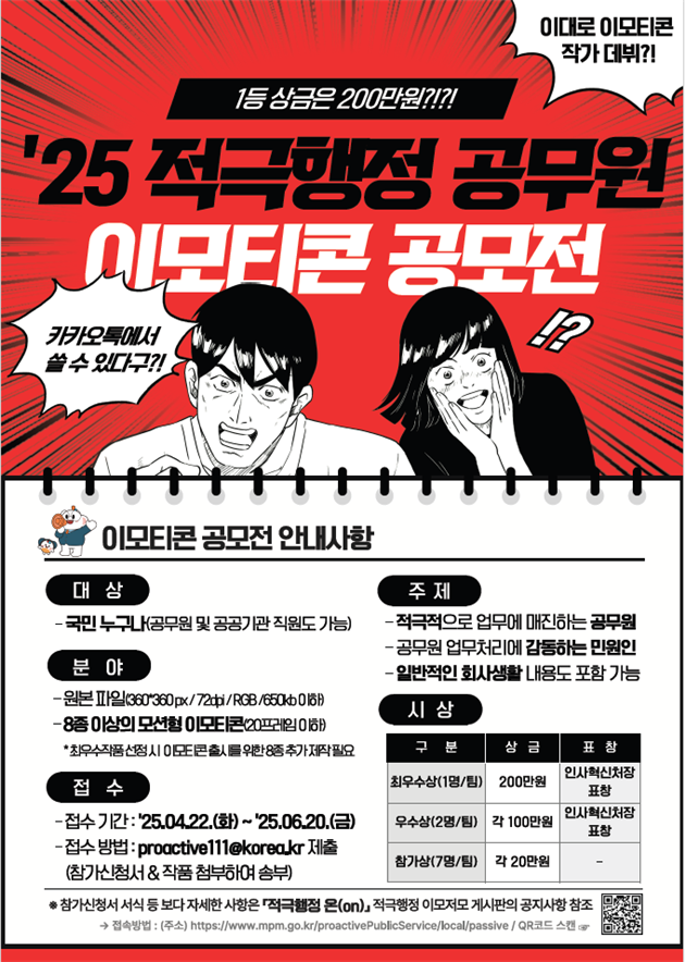 [피앤피뉴스=마성배 기자] 공직사회에 적극행정 문화를 확산시키기 위한 새로운 시도로, 인사혁신처가 ‘2025년 적극행정 공무원 그림말(이모티콘) 공모전’을 개최한다. 국민 누구나 참여할 수 있으며, 공모전 당선작은 실제로 카카오톡에서 배포돼 ‘그림말 작가 데뷔’의 기회도 제공된다.