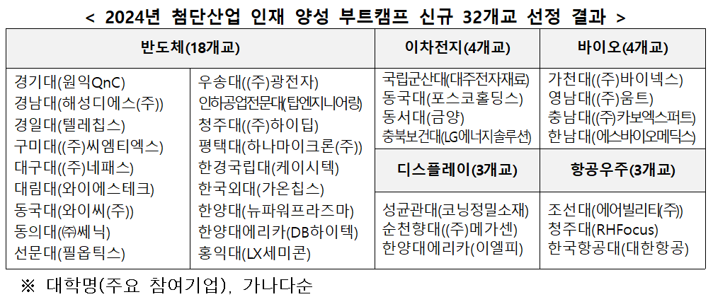 올해는 이차전지, 디스플레이, 바이오, 항공·우주 분야까지 범위를 넓히고, 지원 대학도 대폭 확대해 58개 대학이 사업계획서를 제출했으며, 지난 6월 18일부터 26일까지 진행된 평가를 통해 32개 대학이 최종 선정되었다.