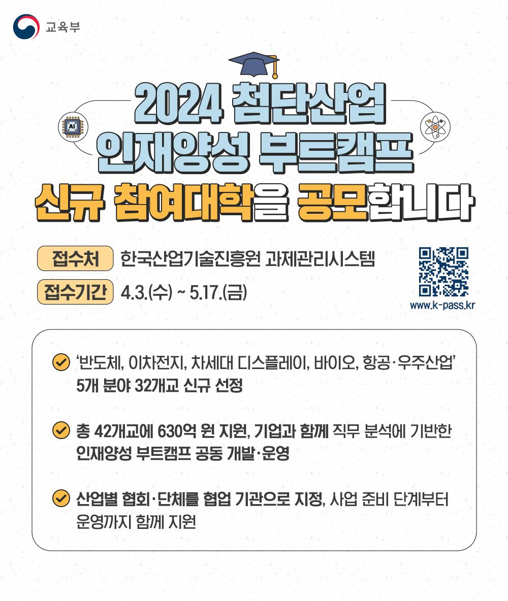 교육부와 한국산업기술진흥원은 8일 2024년 ‘첨단산업 인재 양성 부트캠프’ 선정 결과를 발표한다고 밝혔다.