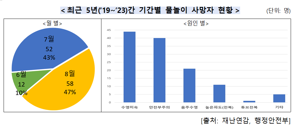 지난 6월 행정안전부가 발표한 재난안전분석 결과에 따르면, 최근 5년간(2019년~2023년) 물놀이로 인한 사망자는 총 122명으로, 여름휴가 절정기인 8월에 사고가 집중적으로 발생했다. 주요 원인은 수영미숙(36%)과 안전부주의(32.7%)로 나타났다. 이에 따라 체계적인 물놀이 안전교육이 사고 예방에 중요하다는 인식이 커지고 있다.