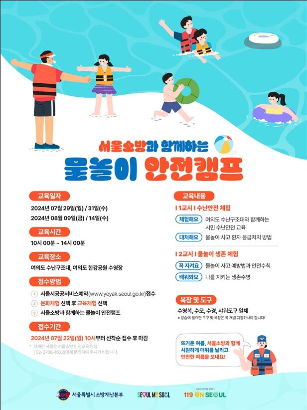 황기석 서울소방재난본부장은 “이번 ‘물놀이 안전캠프’를 통해 참여 학생들이 물놀이 안전사고 예방과 대처법을 직접 체험하고 배우면서 물에 대한 두려움을 극복하고 위급상황 발생 시 올바르게 대응하길 기대한다”며, “앞으로도 시민들의 안전의식과 역량을 높일 수 있는 다양한 안전교육 프로그램을 마련하겠다”고 밝혔다.