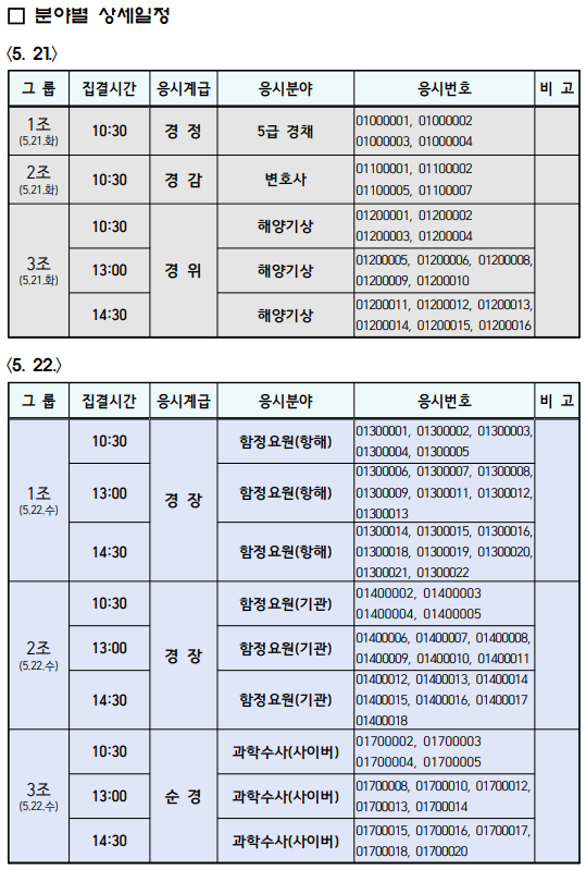 ❍ 【경정】 5급경채, 【경감】 변호사, 【경위】 해양기상, 【경장】 함정요원(항해·기관), 【순경】 과학수사(사이버), 정보통신(전산·통신), 드론, 건축