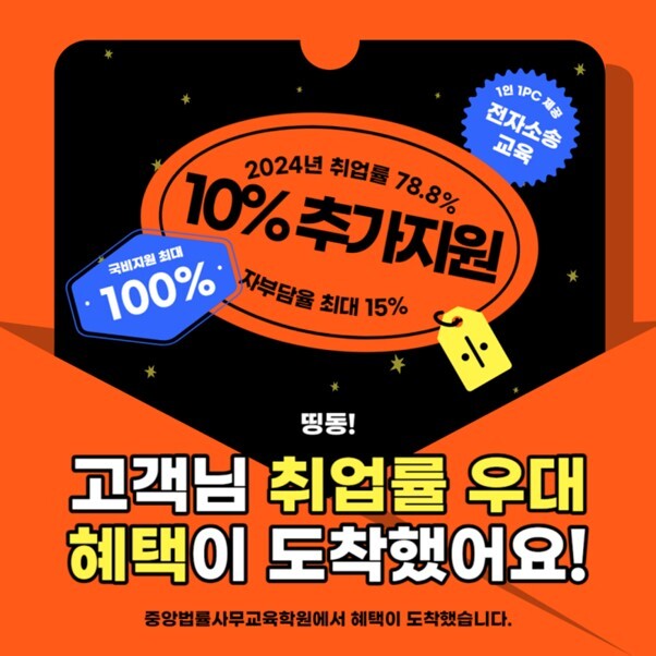 [피앤피뉴스=마성배 기자] 중앙법률사무교육학원이 취업률 우수훈련기관으로 본인부담금 10% 추가 지원한다고 밝혔다.