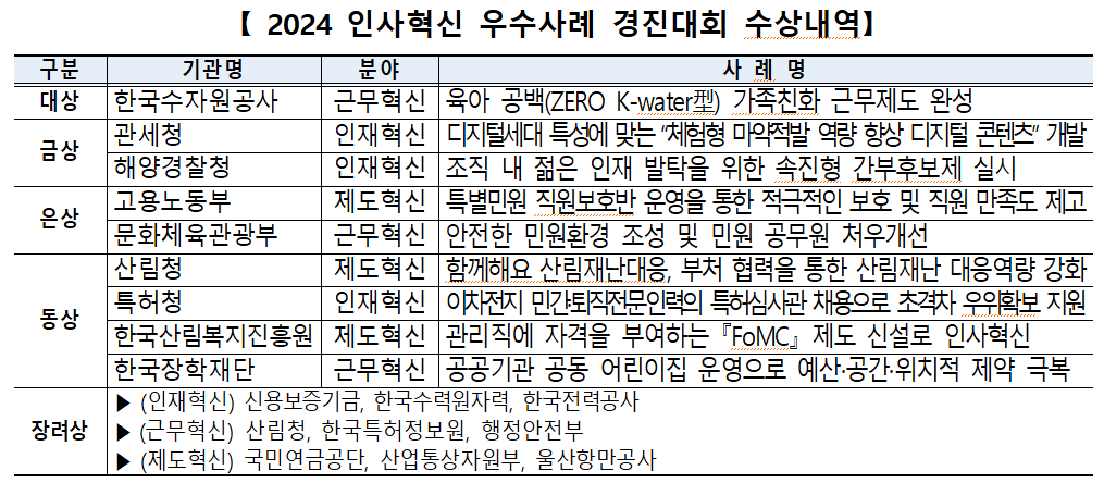 [피앤피뉴스=마성배 기자] 육아 부담을 해결하고 업무 몰입도를 높이기 위한 혁신적 근무제도를 도입한 한국수자원공사가 인사혁신의 선두주자로 인정받았다. 관세청과 해양경찰청 역시 창의적 인재 양성과 조직 경쟁력 강화를 앞세워 금상의 영예를 안았다.