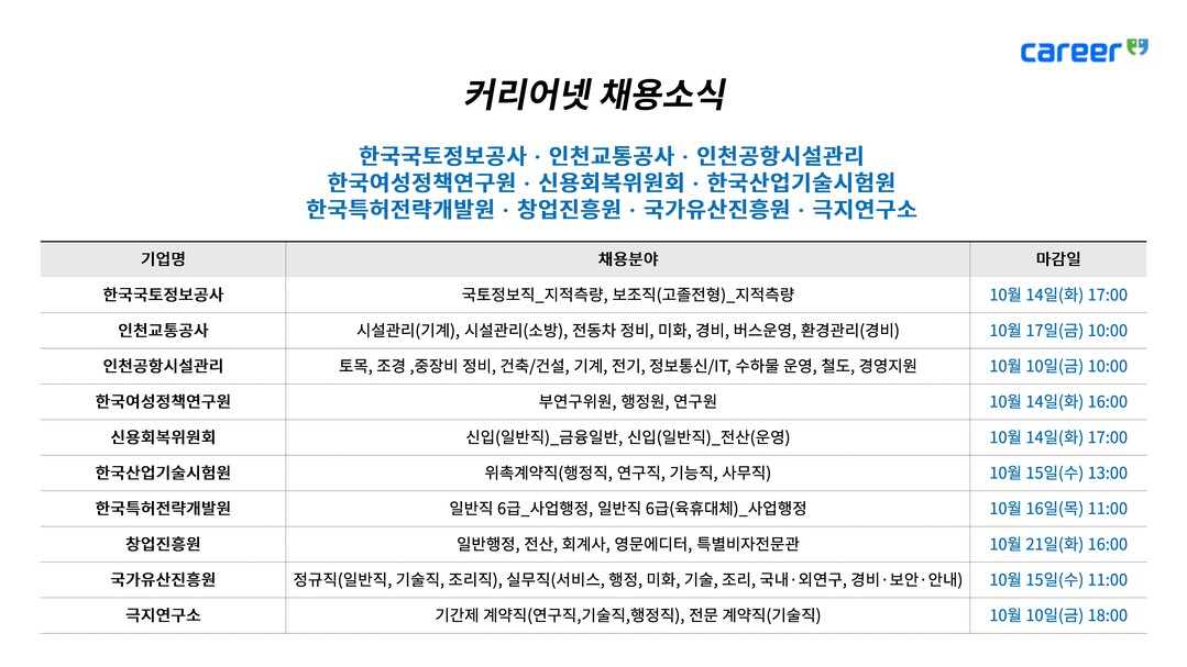 한국국토정보공사, 인천교통공사, 인천공항시설관리, 한국여성정책연구원, 신용회복위원회, 한국산업기술시험원, 한국특허전략개발원, 창업진흥원, 국가유산진흥원, 극지연구소 등 10개 기관이 신입·경력직원을 모집하며 취업 준비생들의 관심이 집중되고 있다.