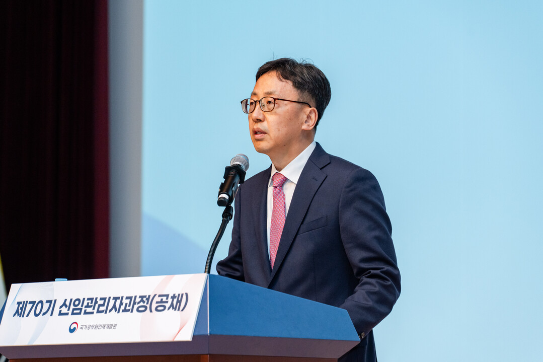 ▲연원정 인사혁신처장이 7일 진천 국가공무원인재개발원에서 열린 ‘제70기 신임관리자과정(공채) 입교식’에서 입교사를 하고 있다.