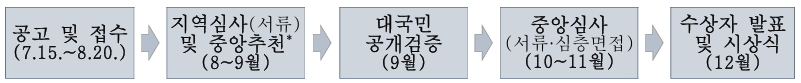 심사 절차는 1차 지역심사 및 중앙행정기관 사전심사, 공개검증을 거쳐 2차 중앙심사(서류 및 면접)로 이어지며, 최종 수상자는 12월 중 발표된다.