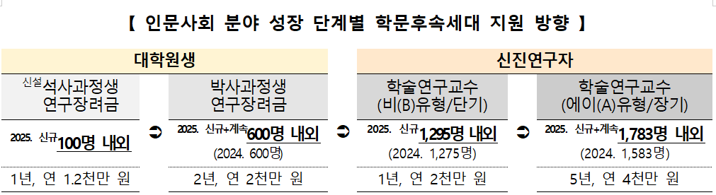 2025년 이공 분야 예산은 전년 대비 811억 원 증가한 5,958억 원으로 역대 최고치를 기록했다. 대학원생의 연구 전념을 돕기 위한 석·박사 연구장려금 지원은 총 2,700개 과제로 확대된다. 또한 박사후연구원 단독연구와 비전임교원 연구 유형을 신설해 연구자들의 독립성과 역량 강화를 지원한다.