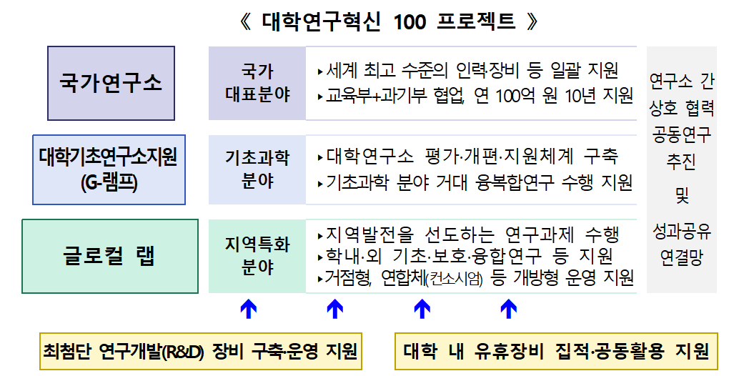 대학 연구소 지원을 위한 ‘대학연구혁신 100 프로젝트’도 시작된다. 국가 대표 연구소를 육성하는 ‘국가연구소’ 사업과 지역 특화 연구소를 지원하는 ‘글로컬랩’ 사업을 통해 대학 연구소가 단계적으로 성장할 수 있도록 돕는다. 아울러 기초연구 기반을 공고히 하기 위해 대학 내 연구장비 활용을 최적화하는 핵심연구지원센터도 확대된다.