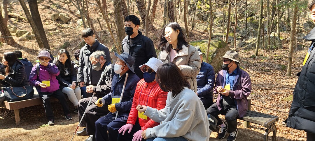 ▲제70기 신임관리자과정(경채) 교육생들이 가야산 국립공원에서 시각장애인과 함께하는 오감맞춤 자연의 소리체험 활동을 진행하고 있다.(국가인재원 제공)