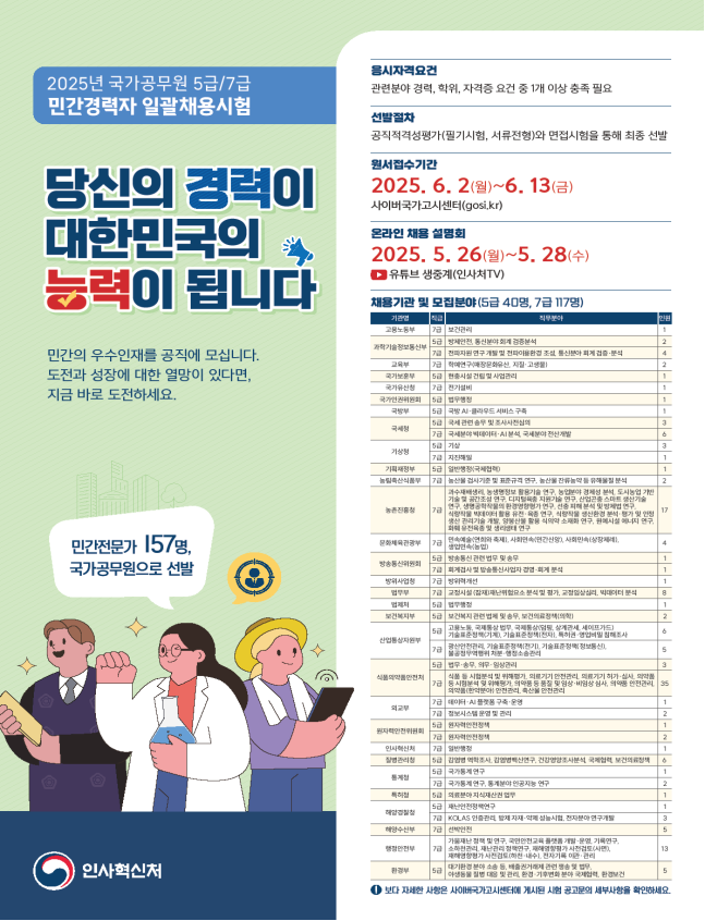 인사혁신처(처장 연원정)는 18일 ‘2025년도 국가공무원 5·7급 민간경력자 일괄채용시험 시행계획’을 사이버국가고시센터(www.gosi.kr)에 공고했다.
