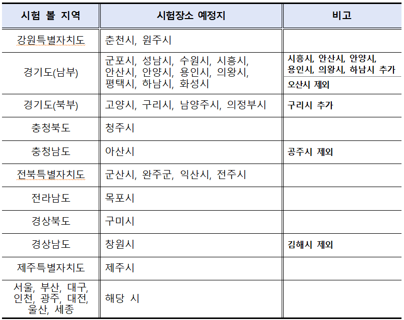 ※ 원서접수 시 시험장소 예정지가 두 곳 이상인 지역을 선택한 경우, 해당 지역의 시험장소 예정지 중 하나에 무작위로 배정됩니다.