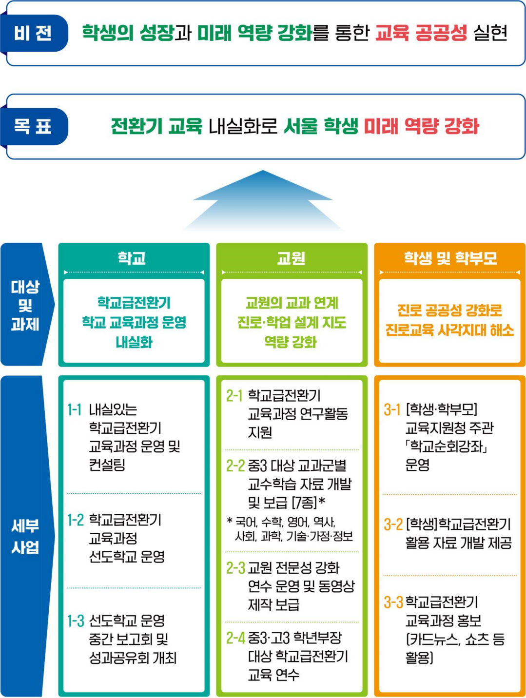 중3 학생과 학부모를 대상으로는 고교 진학 불안을 완화하기 위한 학교순회강좌가 마련되며, 고교학점제 준비를 위한 7개 교과군 교수·학습 자료집과 교원 연수·강의 동영상도 제공된다. 고3 학생의 경우 졸업 전 교과와 창의적 체험활동 시간을 활용해 대학 생활 이해와 사회 적응을 주제로 한 프로그램을 운영할 예정이다.