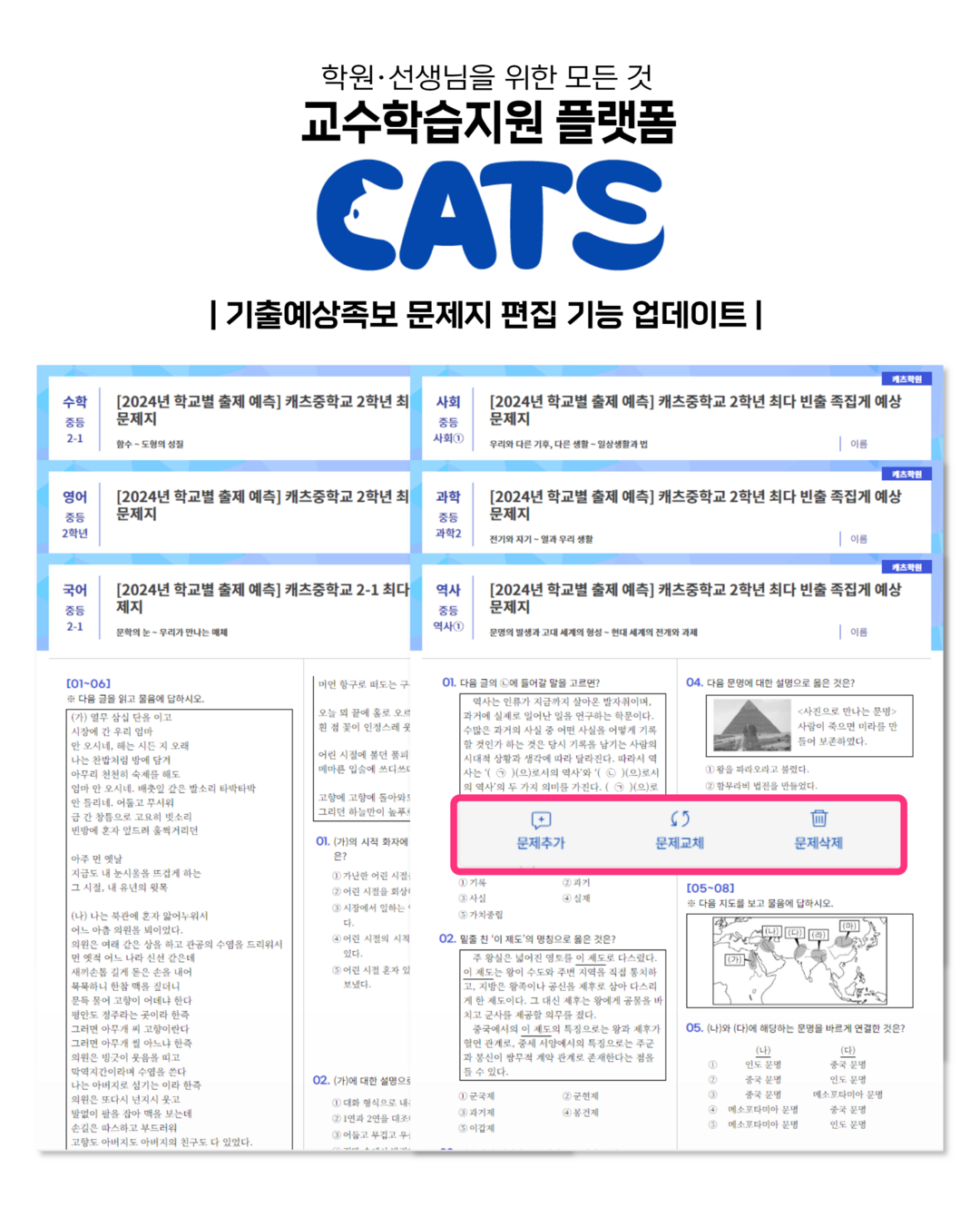 [피앤피뉴스=마성배 기자] 학원용 무료 교수학습지원 플랫폼 ‘캐츠(CATS)’는 전국 학교 ‘전 과목 기출예상족보의 문제편집’ 기능을 업데이트했다고 14일 밝혔다.