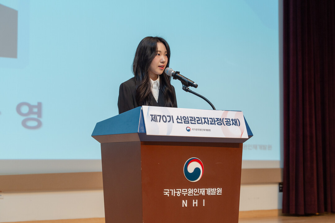 | ▲교육생 대표(자치회장 진다영)가 22일 진천 국가공무원인재개발원에서 열린 ‘제70기 신임관리자과정(공채) 수료식’에서 교육생 소감 발표를 하고 있다. |