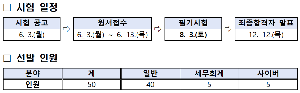 분야별 경쟁률은 ▲일반 82.3대 1(40명 채용/3,293명 지원) ▲세무회계 32.2대 1(5명 채용/161명 지원) ▲사이버 24.6대 1(5명 채용/123명 지원)로 집계됐다.